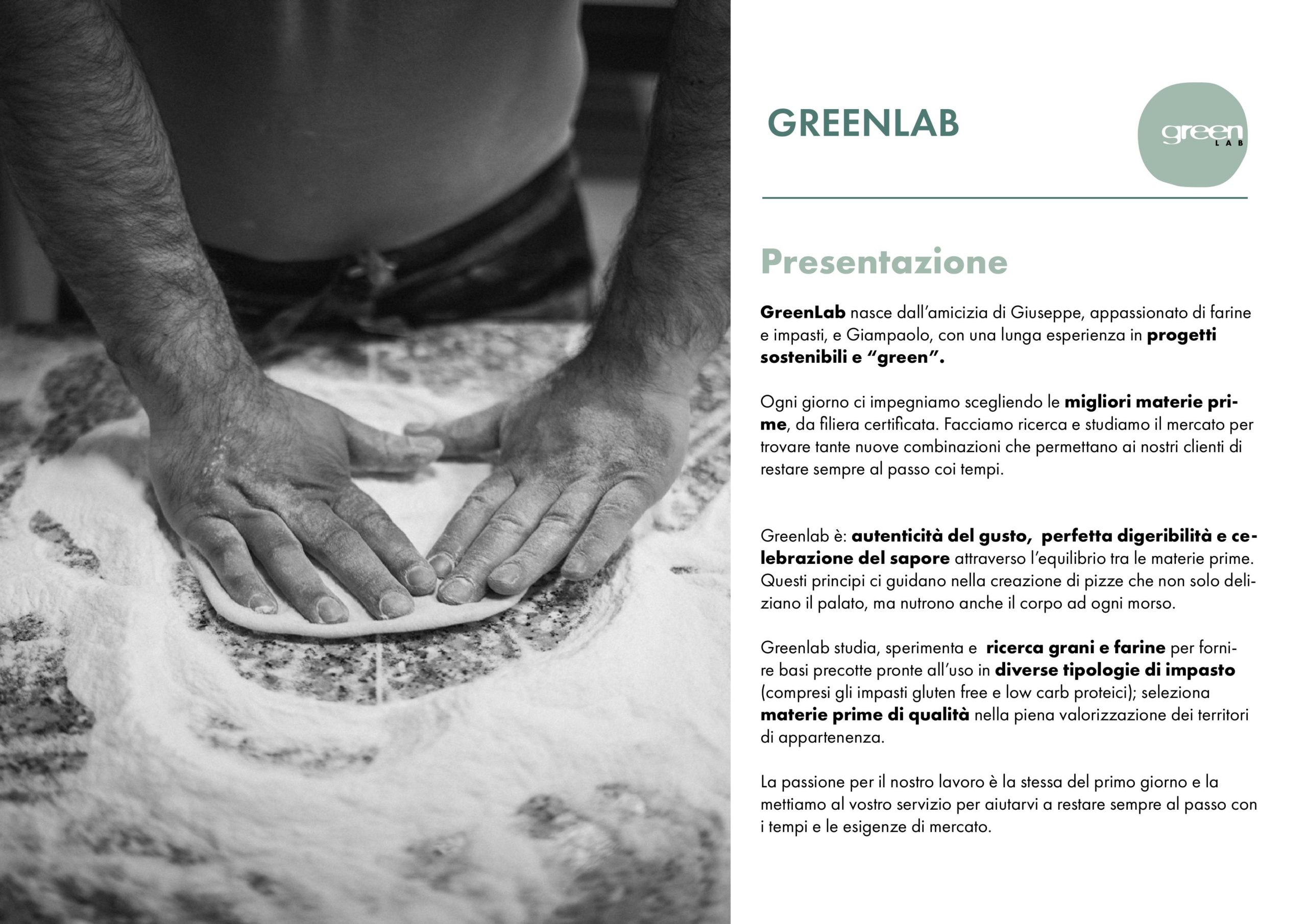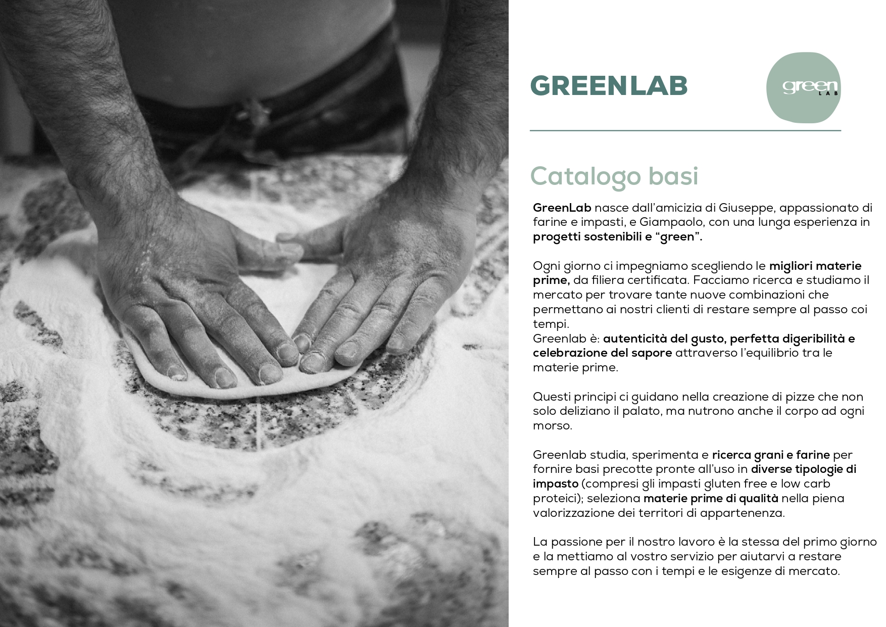 GreenLab studia, sperimenta e ricerca grani e farine per fornire basi precotte pronte all’uso in diverse tipologie di impasto (compresi gli impasti gluten free e low carb proteici); seleziona materie prime di qualità nella piena valorizzazione dei territori di appartenenza.